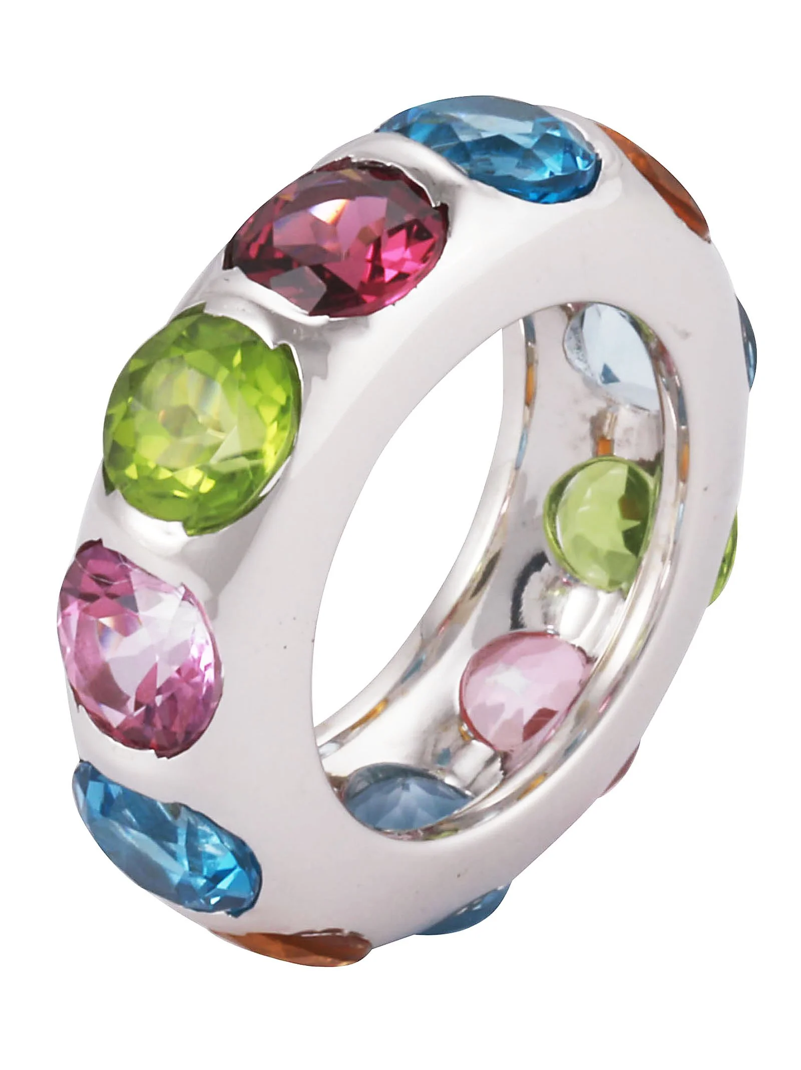 18k white gold ring with eleven round faceted multi gemstone; Amethyst, Citrine, Pink Topaz, Peridot, white Topaz, and Aquamarine